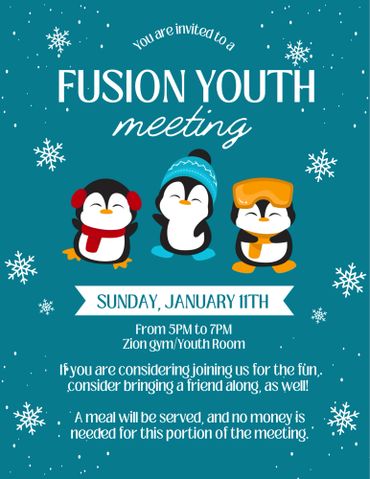 Our next monthly Fusion Youth Group meeting for 7th through 12th grade youth students is scheduled to take place next Sunday, January 11th, from 5PM to 7PM in the Zion gym/youth room.