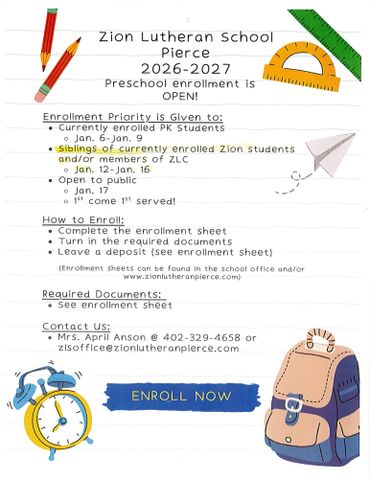 For questions, please contact Mrs. April Anson at (402)-329-4658 or zlsoffice@zionlutheranpierce.com