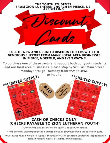 We are still offering discount cards to fundraise for various youth events, activities, and initiatives, and just as before these cards are full of discount offers with the generous support from many local businesses from around this area. If you would like to purchase one of these cards, please speak with a youth student, Mr. J, or call the church office, Monday through Thursday, to inquire.